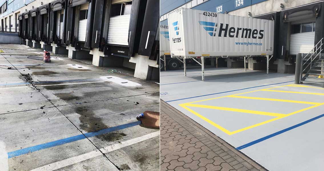 „MC-Bauchemie“ grindų danga ypač gerai veikia intensyvaus eismo vietose. Taigi net ir pakrovimo rampos, tokios kaip Langenhagene įsikūrusiame „Hermes“ krovinių centre, kurias beveik kasdien intensyviai naudoja sunkiasvorės krovininės transporto priemonės, gali būti geriau ir patvariau apsaugotos nuo pažeidimų, kuriuos sukelia didžiulis jas veikiantis eksploatacinis krūvis. Kitas pliusas – greitas padengimas, leidžiantis efektyviai atlikti darbus vykstant objekto eksploatacijai ir taip ženkliai sumažinti apribojimus bei prastovas dėl tokių atnaujinimo priemonių. Tai užtikrina aukštas planavimo patikimumas, kuris taupo laiką bei pinigus – ne tik remontuojant pakrovimo ir rampų zonas, bet ir apskritai naudojant sandėliavimo plotus, padėklų laikymo vietas ir krautuvų judėjimo maršrutus.